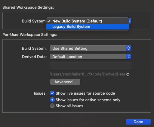 File에 Workspace Settins를 클릭하고 나오는 Build System에서 Legacy Build System을 선택하고 Done을 클릭한다.(이부분은 마지막에 빌드가 정상적으로 되면 다시 Default로 설정을 해주면 된다.)