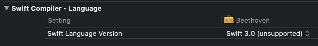 PodFile에 해당 라이브러리 build settings에 들어가서 보면 아래와 같이 Swift 3.0으로 version이 설정되어있는게 보인다.