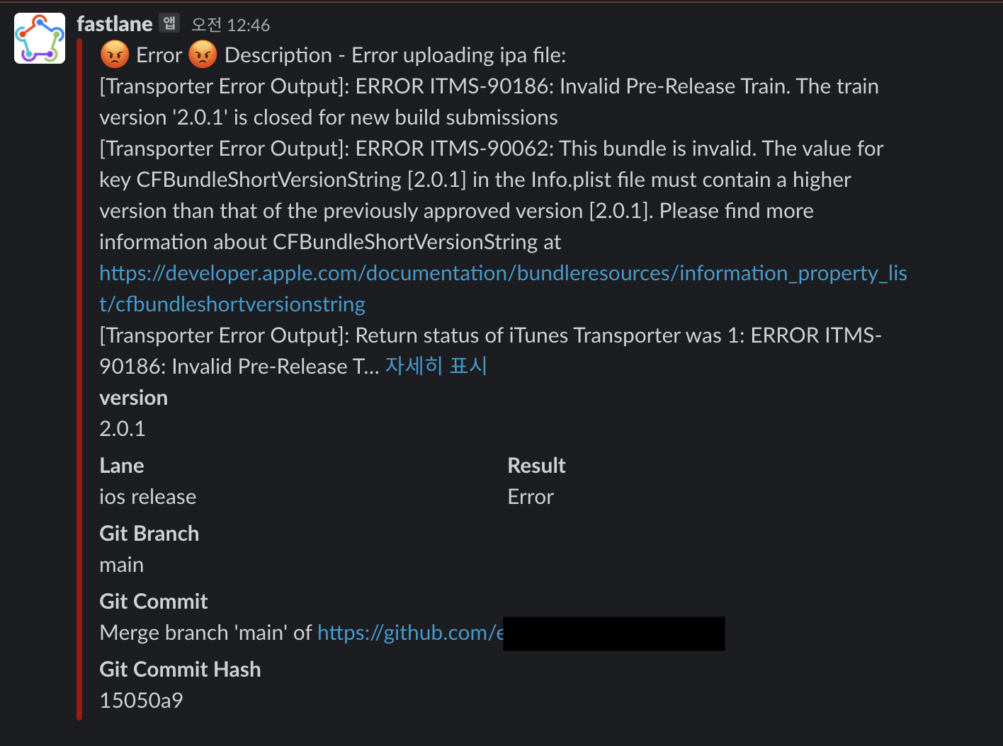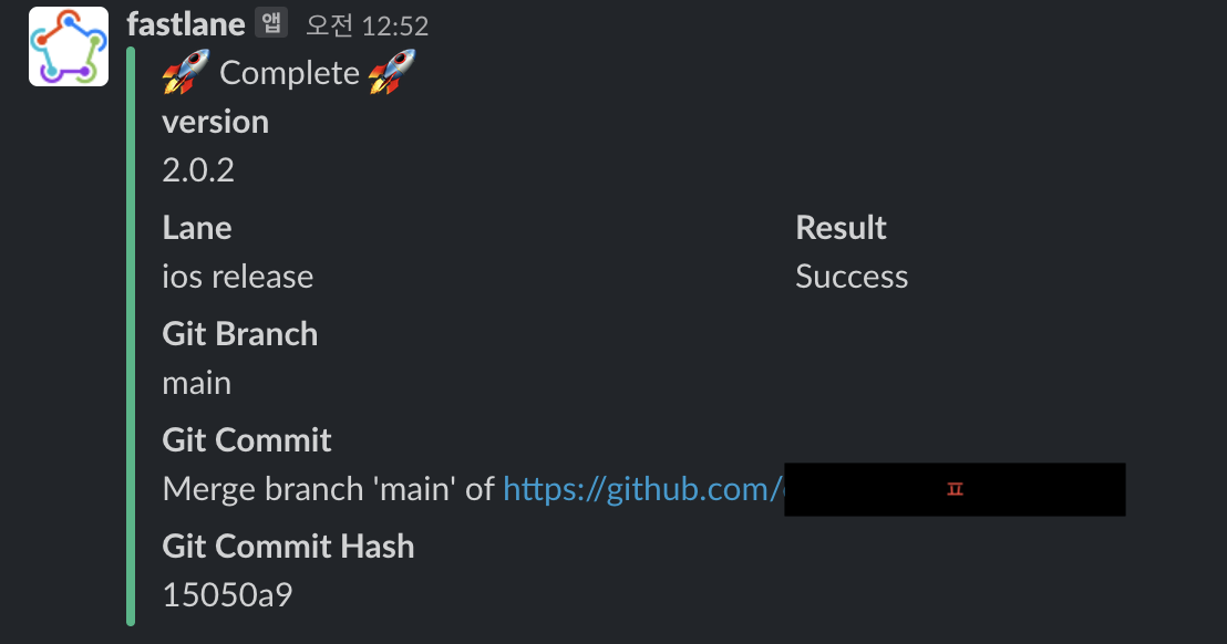 Fastfile로 돌아가서 적절한 인자값을 사용하여 slack 메소드를 호출해주면 된다.