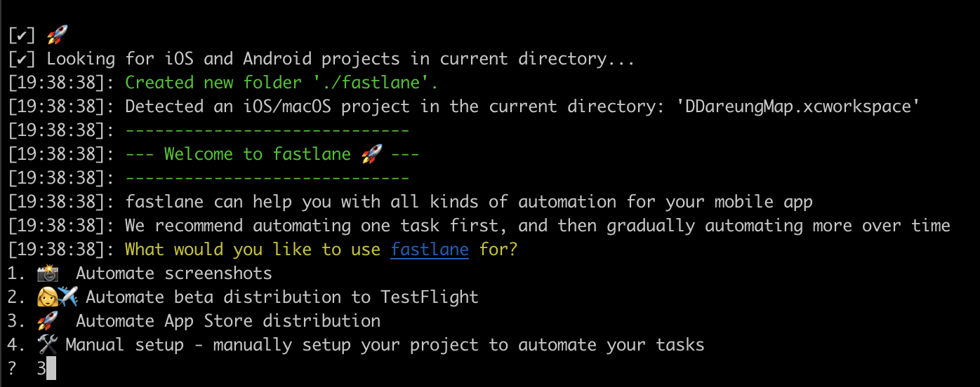 그다음 fastlane init을 진행하면 아래와 같이 4가지의 선택을 할 수 있는 로그가 뜨는데